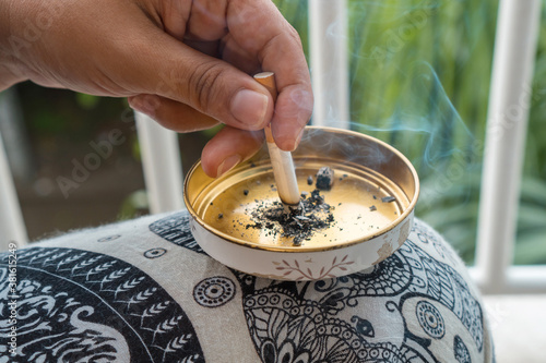 Man smoking cigarette and using an ashtray