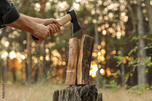 Man splitting firewood with axe in forest, closeup