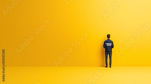 Man standing against vibrant yellow wall with text "Coming Soon"