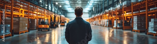 Man Standing in Warehouse with Forklift and Shelves