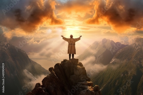 Man standing on top of the mountain and looking at the valley,The man thank God on the mountain.Generative Ai