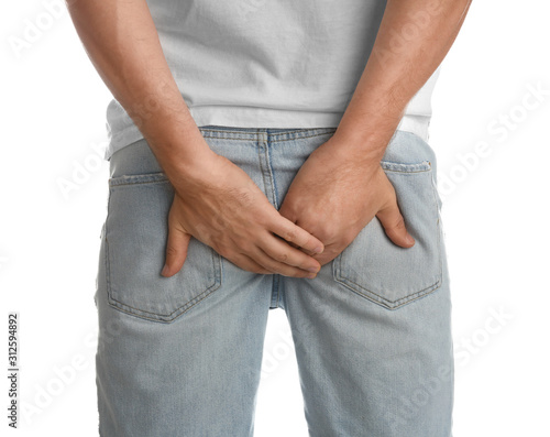 Man suffering from hemorrhoid on white background, closeup