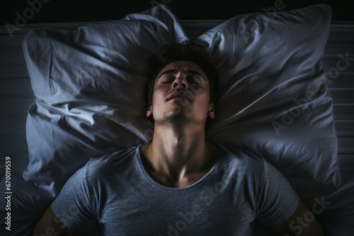 Man suffering from insomnia on bed. Sleep fear worried night problem. Generate Ai