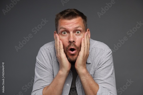 Man suffering from panic attack on grey background