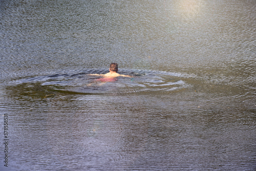 Man swimming in a fresh water lake of calm water the water has ripples as he swims