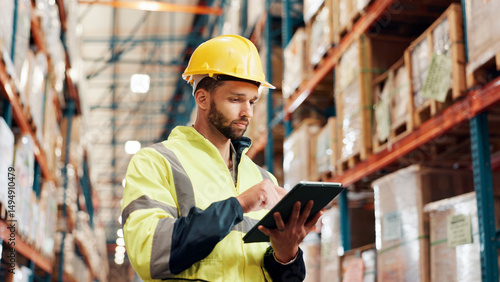 Man, tablet or distribution with inspection at plant, shipping information scroll or schedule for quality control. Logistics, supplier or delivery report on tech for inventory management at warehouse