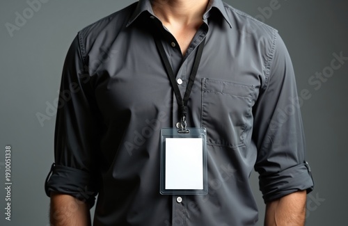 Man torso wearing gray shirt with blank identification badge and black lanyard. Ready for name personalization, access card holder for event, office work, business meeting.