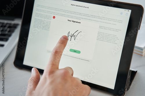 Man touching to the tablet screen with his finger while signing the document online