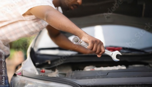 Man trying to fix his broken car on road. Generated image