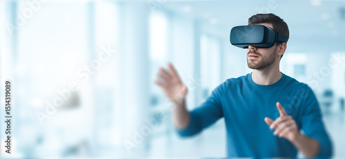 Man using a virtual reality headset in a bright modern interior space.