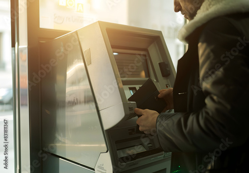 "Man Using ATM Machine for Automatic Savings, Holding Black Wallet