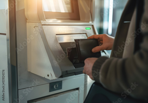 "Man Using ATM Machine for Automatic Savings, Holding Black Wallet