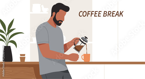 Man using French press coffee maker at home. Coffee break concept. Minimalist flat design illustration