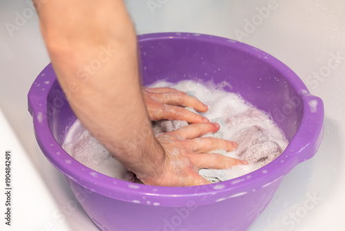 Man washing clothes by hand in a purple basin. Close-up of a man's hands washing laundry in a small purple basin in a white bathroom, domestic work, manual labor, frugality, and simplicity