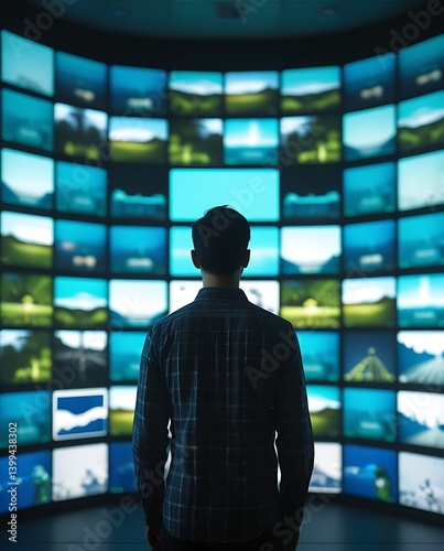 Man watching a massive digital video wall displaying vibrant landscapes and nature footage in a high-tech media room, symbolizing information overload and technology.