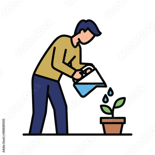 Man watering young plant in pot gardening growth care vector illustration flat design scalable graphic
