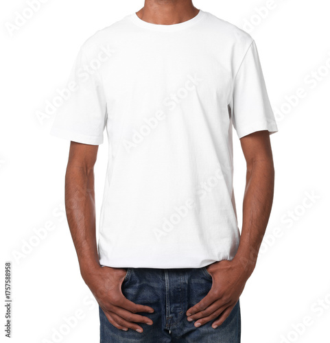 Man wearing stylish t-shirt on white background, closeup. Mockup for design