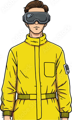 Man wearing virtual reality headset and yellow jacket exploring digital environment modern technology concept