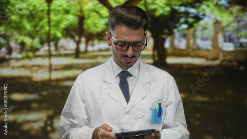 Man wearing white lab coat and glasses holding tablet to chest amid sunlit green foliage in park; enthusiasm.