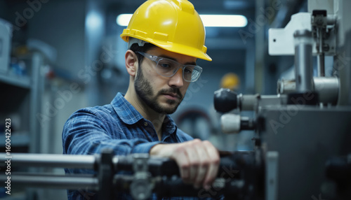Man wearing yellow hard hat, safety glasses works on industrial machine. Technician in blue checkered shirt operates heavy equipment in factory workshop. Focus on quality control, maintenance,