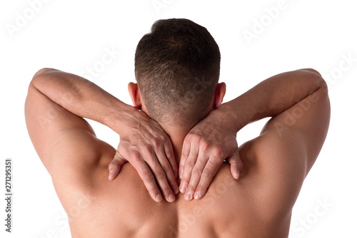 Man with a pain in his neck. The athlete clings to a sore neck. Sports medicine concept