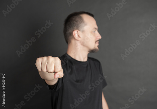 Man with beard ready to fight with fist up gesture on dark background. Focus on hand