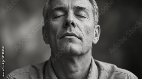Man with closed eyes and serene expression practicing mindfulness outdoors in soft light