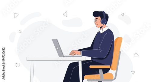 Man with headphones working on a laptop at a desk, modern flat illustration