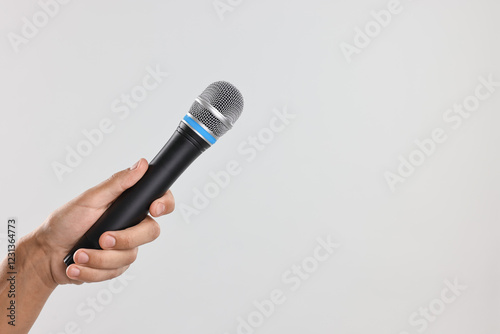 Man with microphone on light grey background, closeup. Space for text