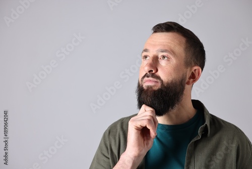 Man with mustache and beard on light grey background. Space for text