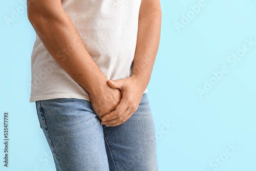Man with prostate problem on blue background, closeup