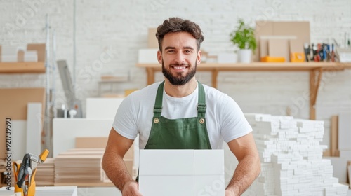 Man worker installing ceramic tiles.