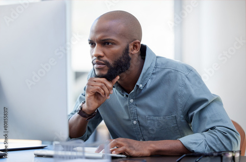 Man, working and thinking with computer in office, employee and online research for company on internet tech. Reading, thoughtful and planning for corporate work, problem solving and idea and desk