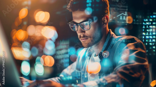 Man Working on Laptop Surrounded by Digital Data. Man in glasses working intently on his laptop, surrounded by digital data visuals, representing data analysis, technology, and the modern gig economy.