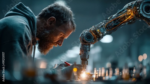 Man working with robotic arm in modern industrial setting