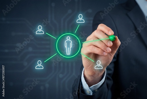Manager hand drawing connections between people icons on virtual screen for human resources concept