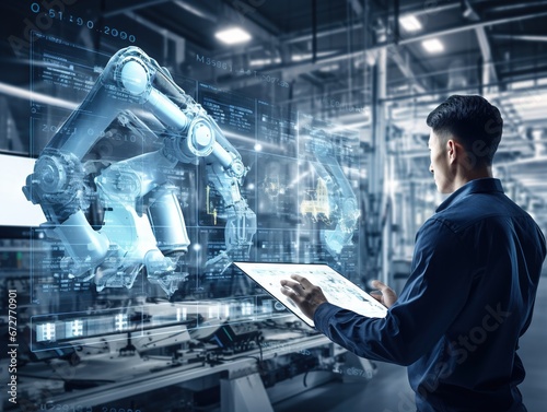 Manager Technical Industrial Engineer working and control robotics with monitoring system software and icon industry network