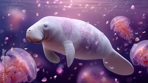 Manatee, Manatee swimming underwater surrounded by jellyfish and particles.