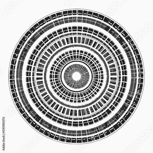 Mandala with concentric rings of tiny black rectangles forming a bold radial layout white background
