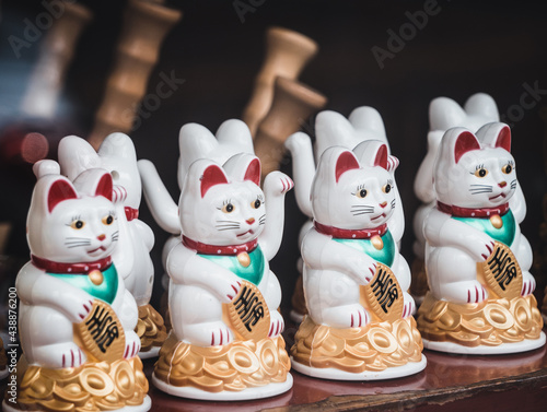Maneki-Neko Japanese lucky waving beckoning cat in shop window