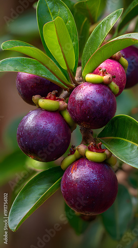 Mangosteen fruit cluster purple rind glossy skin green calyx tropical fruit on leafy branch ripe and fresh