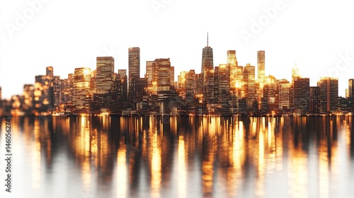Manhattan skyline at dusk, tall buildings glowing with golden light, waterfront reflections, panoramic shot, isolated white background for clarity.