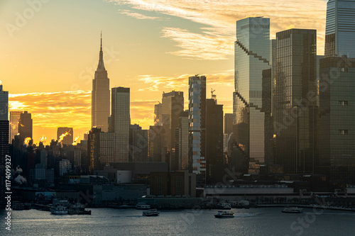 Manhattan skyscrapers skyline, stunning morning light, city scape water reflection, travel destination background image, selective focus isolated subject