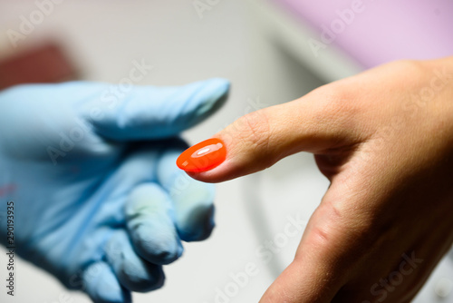 Manicure process in beauty salon, close up