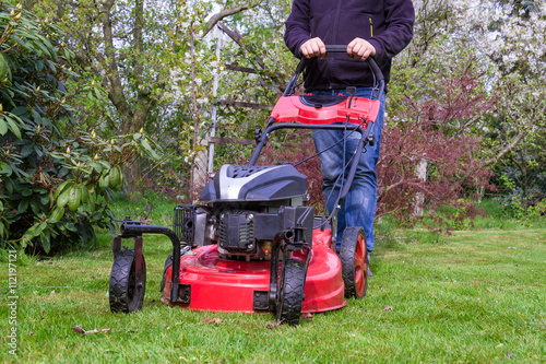 Mann beim Rasen mähen