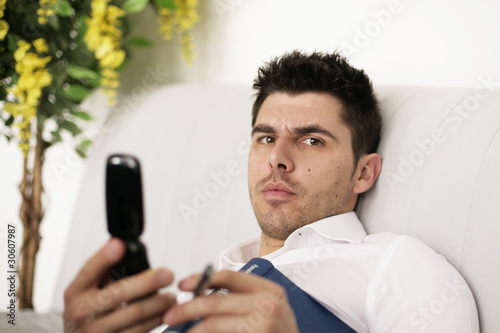Mann entspannt zuhause am Telefon