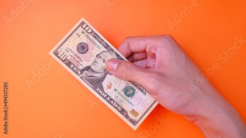 Man's hand is making a payment. Business Investment Economy Saving Loan Income Money and Finance concept. Male hand showing dollar cash on an orange background. Ten Dollar 10 USD. Prosperity concept.