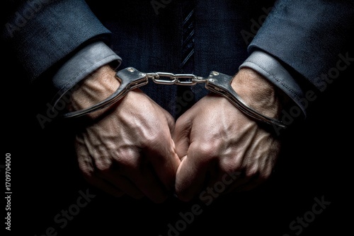 Mans hands in handcuffs wearing a suit against a dark background
