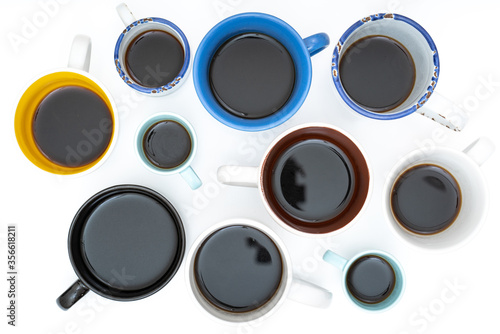 Many cups of coffee on table flat lay copy space.