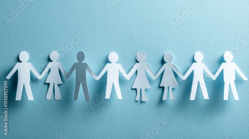 Many diverse paper human figures standing together on light blue background representing diversity, equity, inclusion, unity, teamwork, social harmony, community support, equal opportunity, multicultu